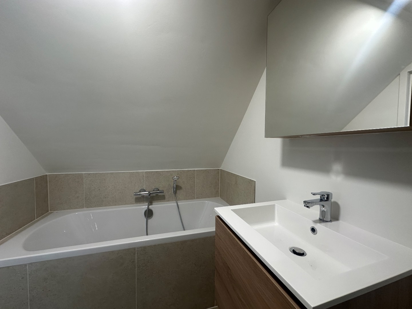 Indeling: inkomhal met toegang tot berging, lichtrijke leefruimte met open keuken (inclusief toestellen), slaapkamer met ensuite badkamer (lavabomeubel en ligbad), afzonderlijk toilet. Parkeerplaats ook inbegrepen.