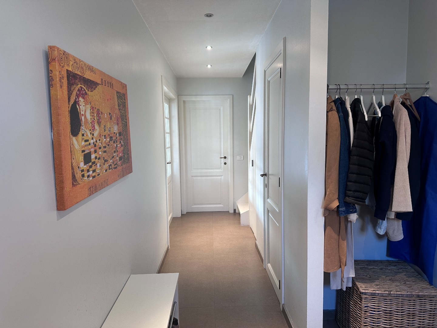 Inkomhal met gastentoilet, bureauruimte, een lichtrijke leefruimte en een open keuken met toegang tot een extra douchekamer.