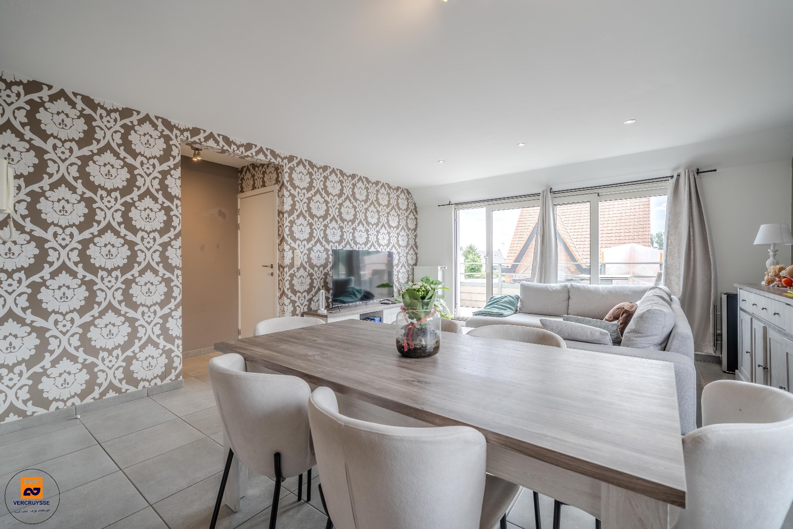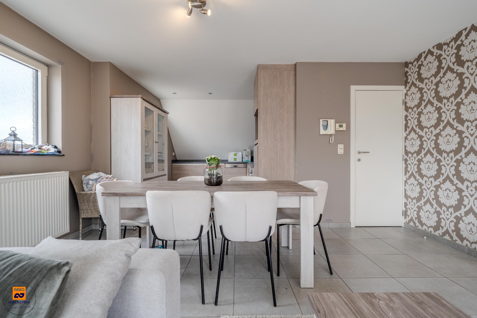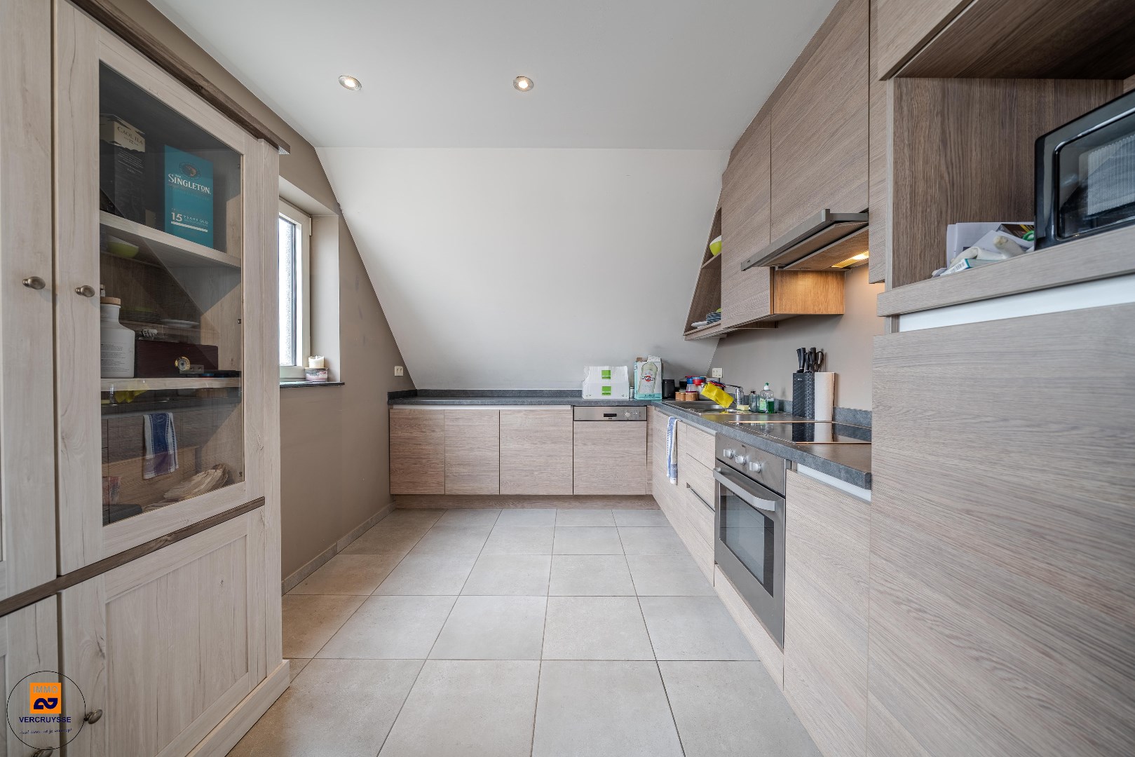 Het appartement beschikt over een lichtrijke en ruime woonkamer met een groot schuifraam naar het zonneterras (het terras is zuidgericht en zit een beetje verdoken, biedt veel privacy). Je krijgt de hele dag de zon binnen in je leefruimte. De open keuken, in een degelijke kwaliteit, is volledig ingericht, met een mooi werkblad, oven, vaatwasser, frigo, kookplaat en dampkap. Afzonderlijk toilet, badkamer met douche en dubbel lavabomeubel. Boven zijn er 2 praktische slaapkamers, een grotere kamer en een mooie kinderkamer.