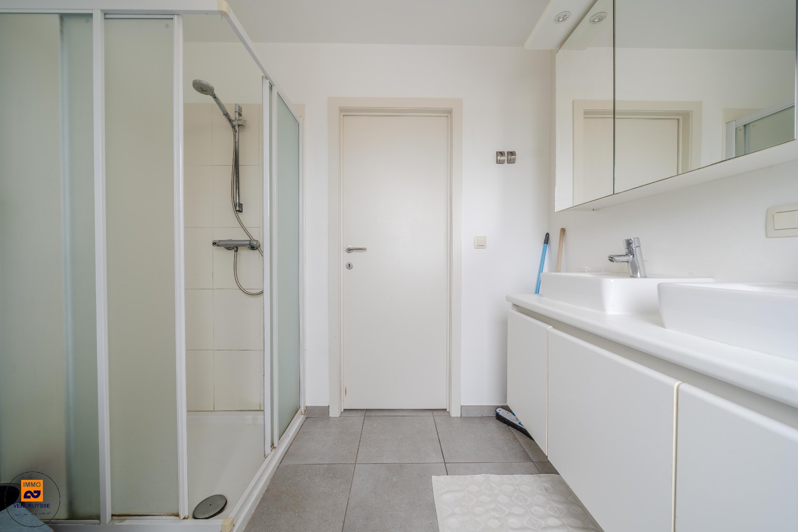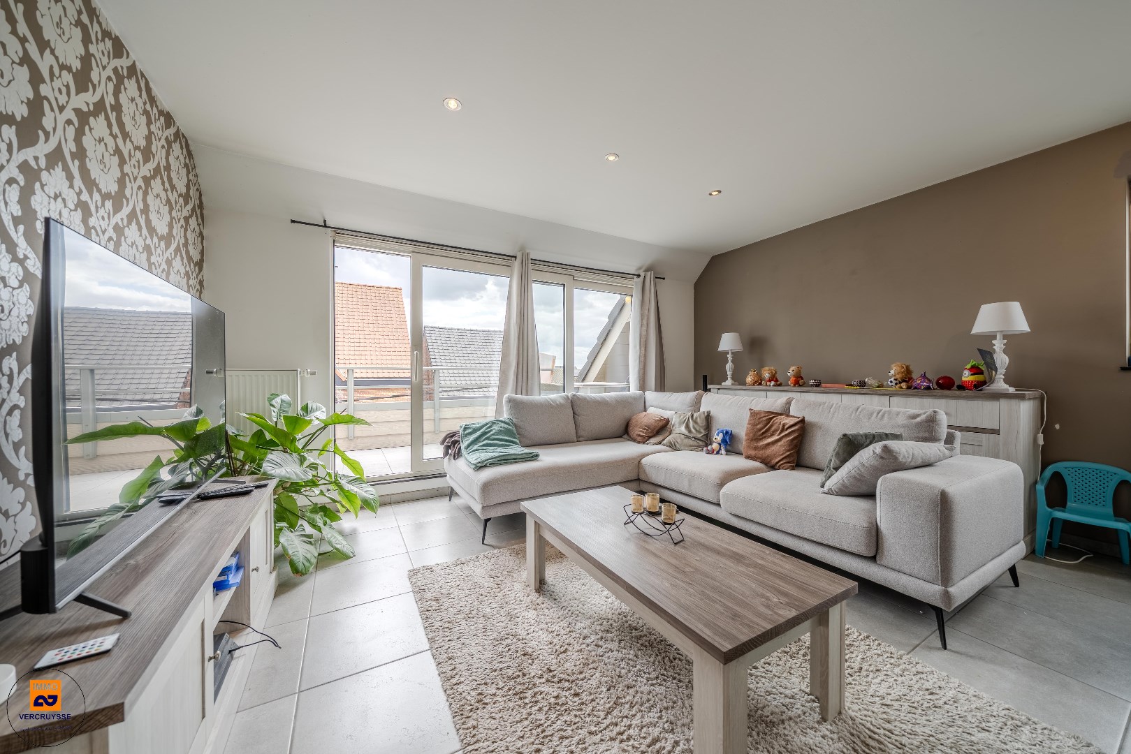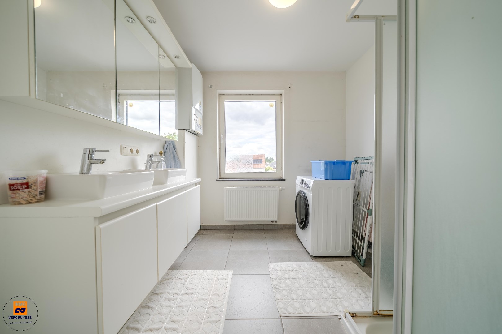 Het appartement beschikt over een lichtrijke en ruime woonkamer met een groot schuifraam naar het zonneterras (het terras is zuidgericht en zit een beetje verdoken, biedt veel privacy). Je krijgt de hele dag de zon binnen in je leefruimte. De open keuken, in een degelijke kwaliteit, is volledig ingericht, met een mooi werkblad, oven, vaatwasser, frigo, kookplaat en dampkap. Afzonderlijk toilet, badkamer met douche en dubbel lavabomeubel. Boven zijn er 2 praktische slaapkamers, een grotere kamer en een mooie kinderkamer.