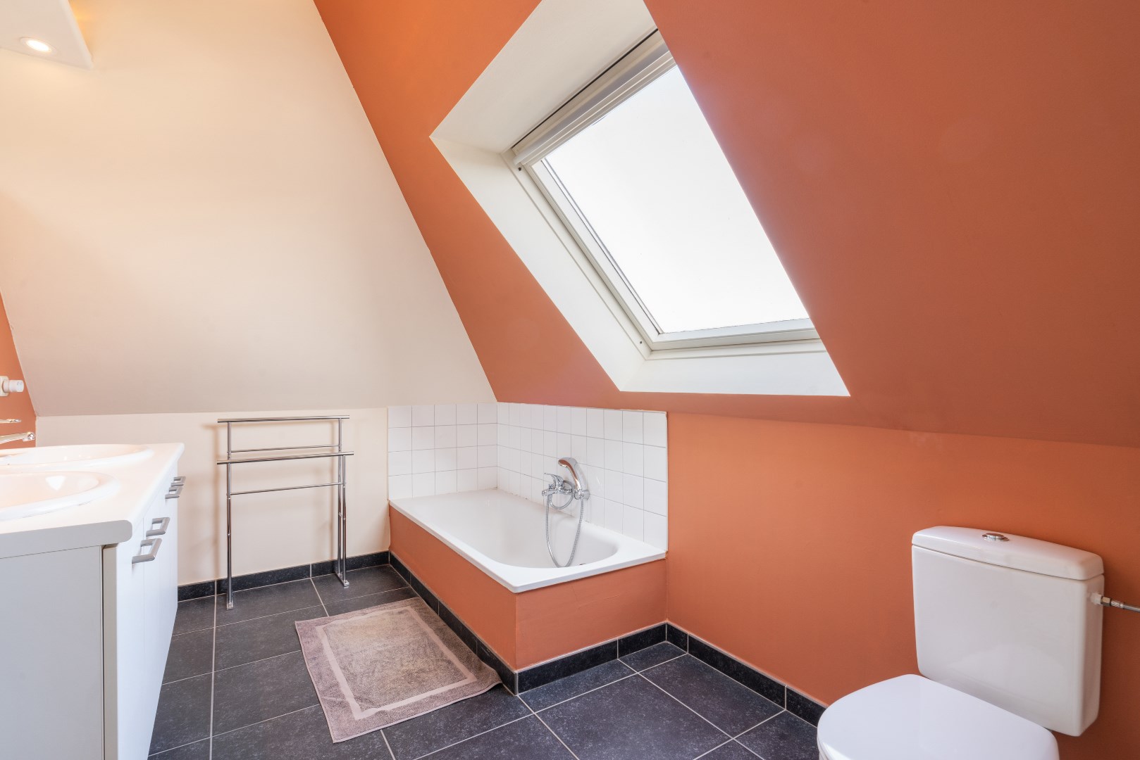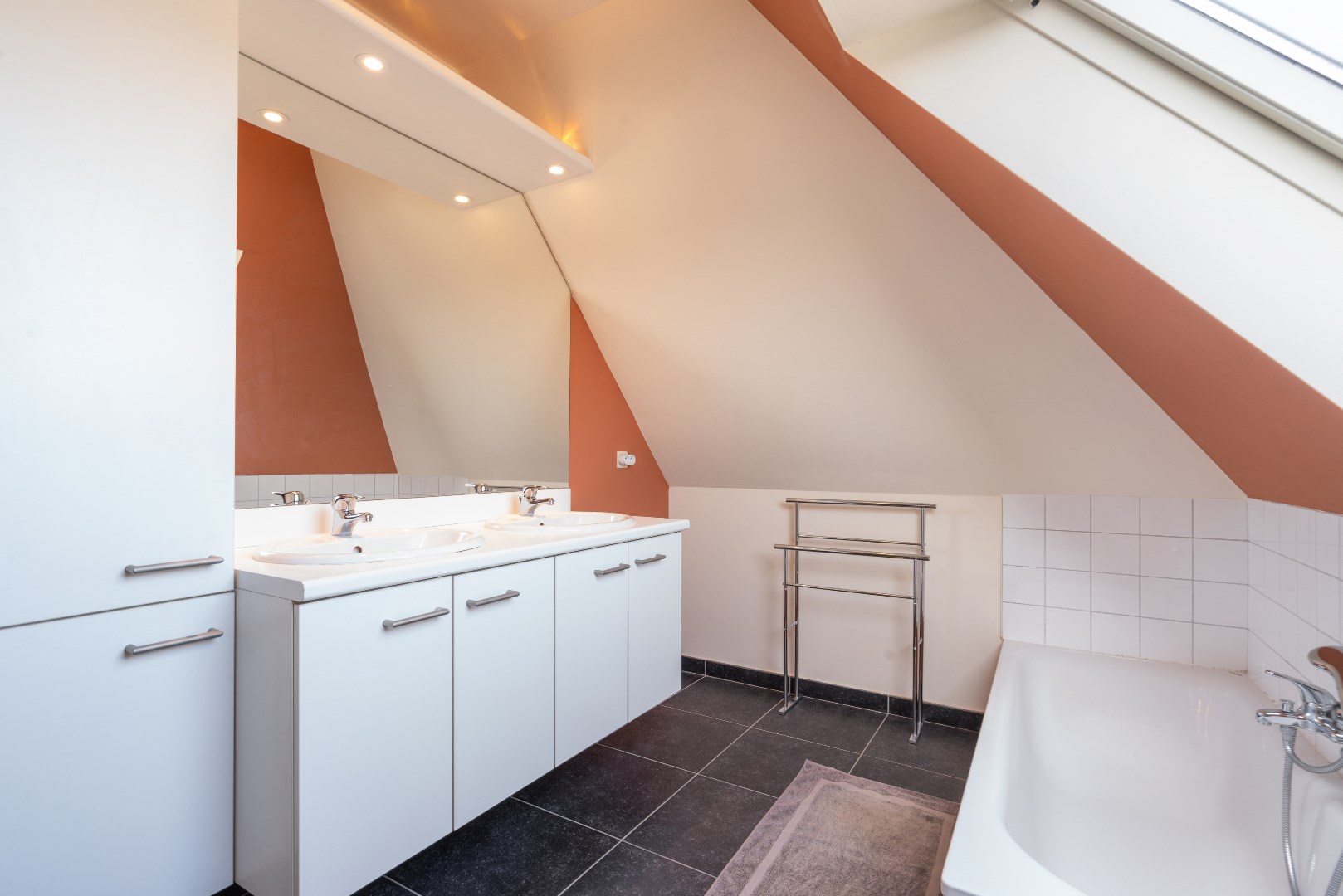 Het appartement is gelegen op de 2de verdieping (een lift aanwezig) met een mooie en ruime leefruimte, open keuken, terras, toilet. Binnentrap naar de bovenste verdieping waar er 2 mooie ruime slaapkamers zijn, alsook een grote badkamer (met dubbel lavabomeubel, ligbad, toilet).