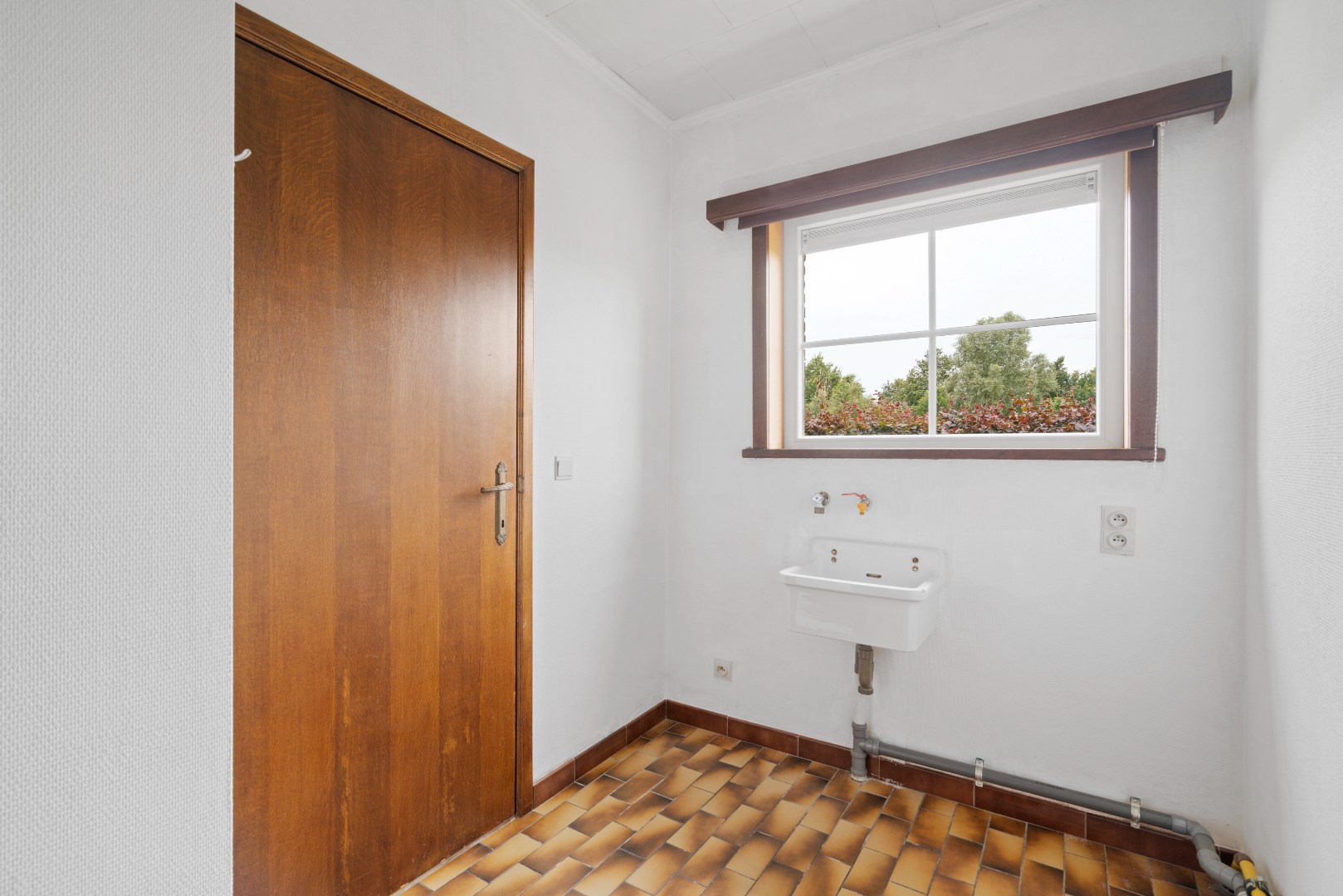 De woning omvat op de benedenverdieping een ruime inkomhal, een grote ingerichte keuken met aansluitend een berging en een wasplaats, een ruime eetplaats met een groot terrasraam, toegang tot een zuidgericht terras en de mooie achterliggende privé tuin, een toilet, een eerste slaapkamer of bureau en een inpandige garage.